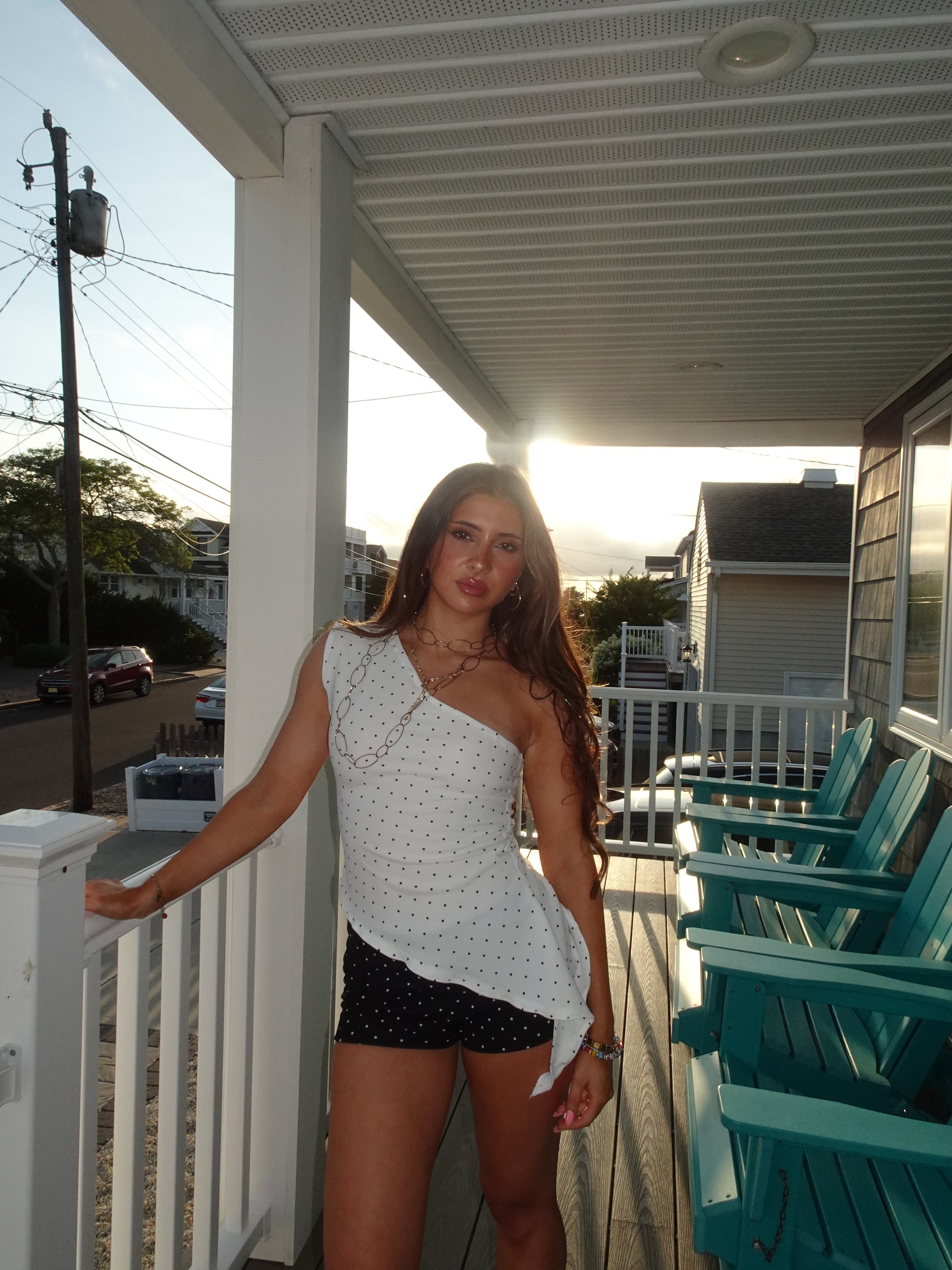 The Dot Girl Summer Top brings a playful twist to your wardrobe with its asymmetrical design and stretchy fabric. Perfect for a fun night out, this cute top combines comfort and style effortlessly, making every outing a little more special.